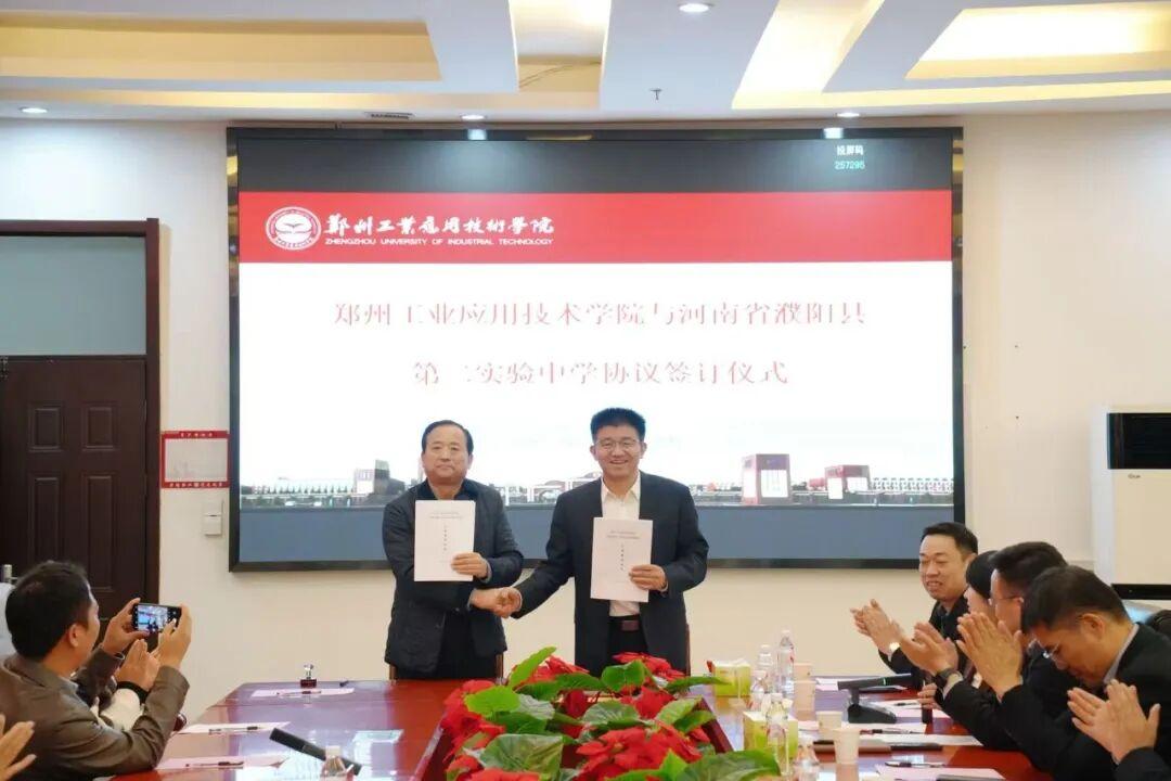 10月16日,郑州工业应用技术学院与河南省濮阳县第二实验中学生源基地协议签订仪式在行政管理中心二楼会议室举行。此次签约,不仅是郑工学院发展史上开启教育新篇章的重要征程,更是通过与基础教育领域优质学校的深度融合,将共建生源基地转化为推动校地教育协同的具体实践。濮阳县第二实验中学教育集团董事长蔡玉坤,校长张克来、副校长段盈武等班子成员及师生代表;中原华信控股集团总裁、郑州工业应用技术学院理事长谷建光,校长闫兵携班子成员、有关部门负责人参加签订仪式。签订仪式由郑州工业应用技术学院副校长贾圣强主持。